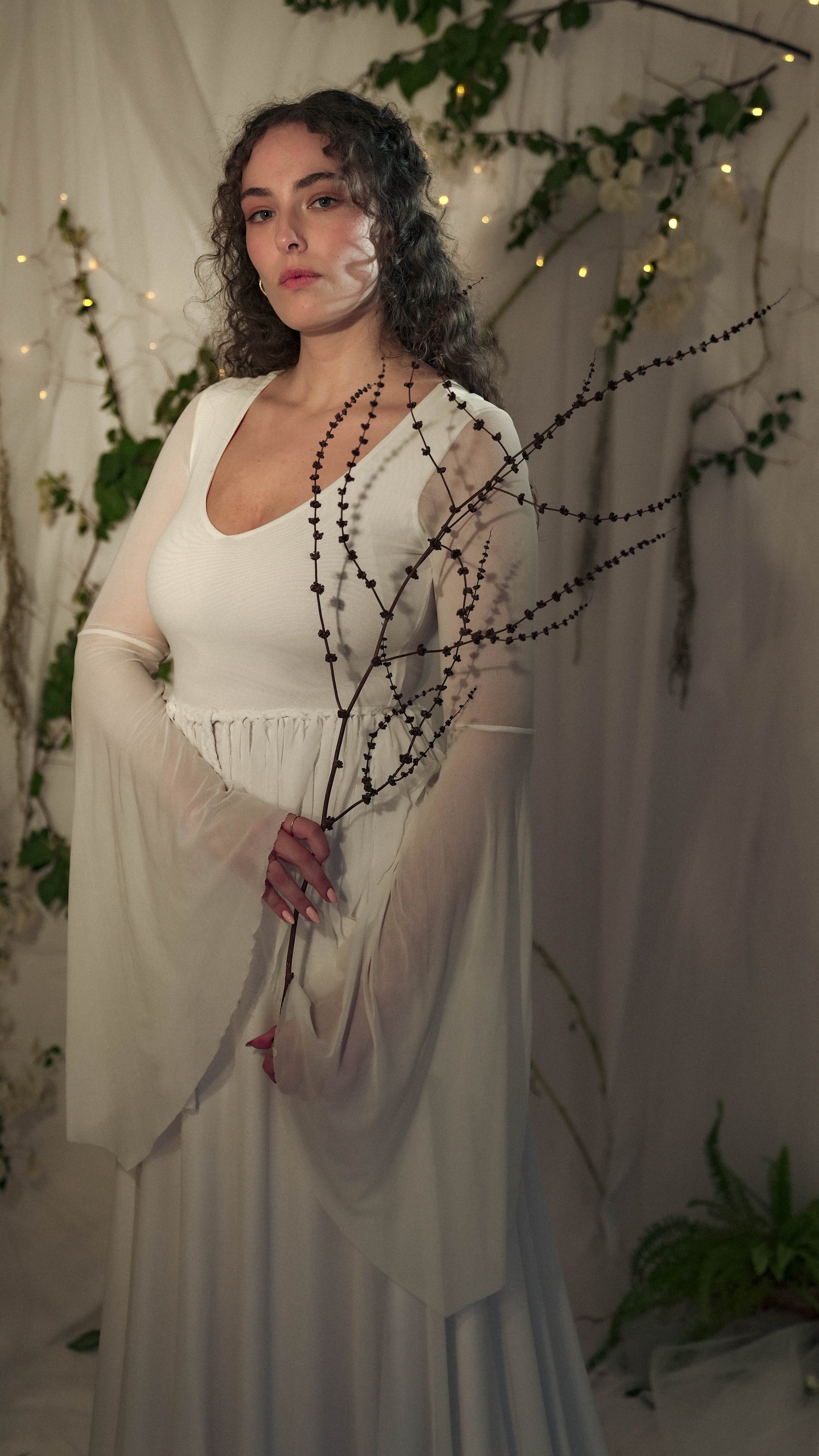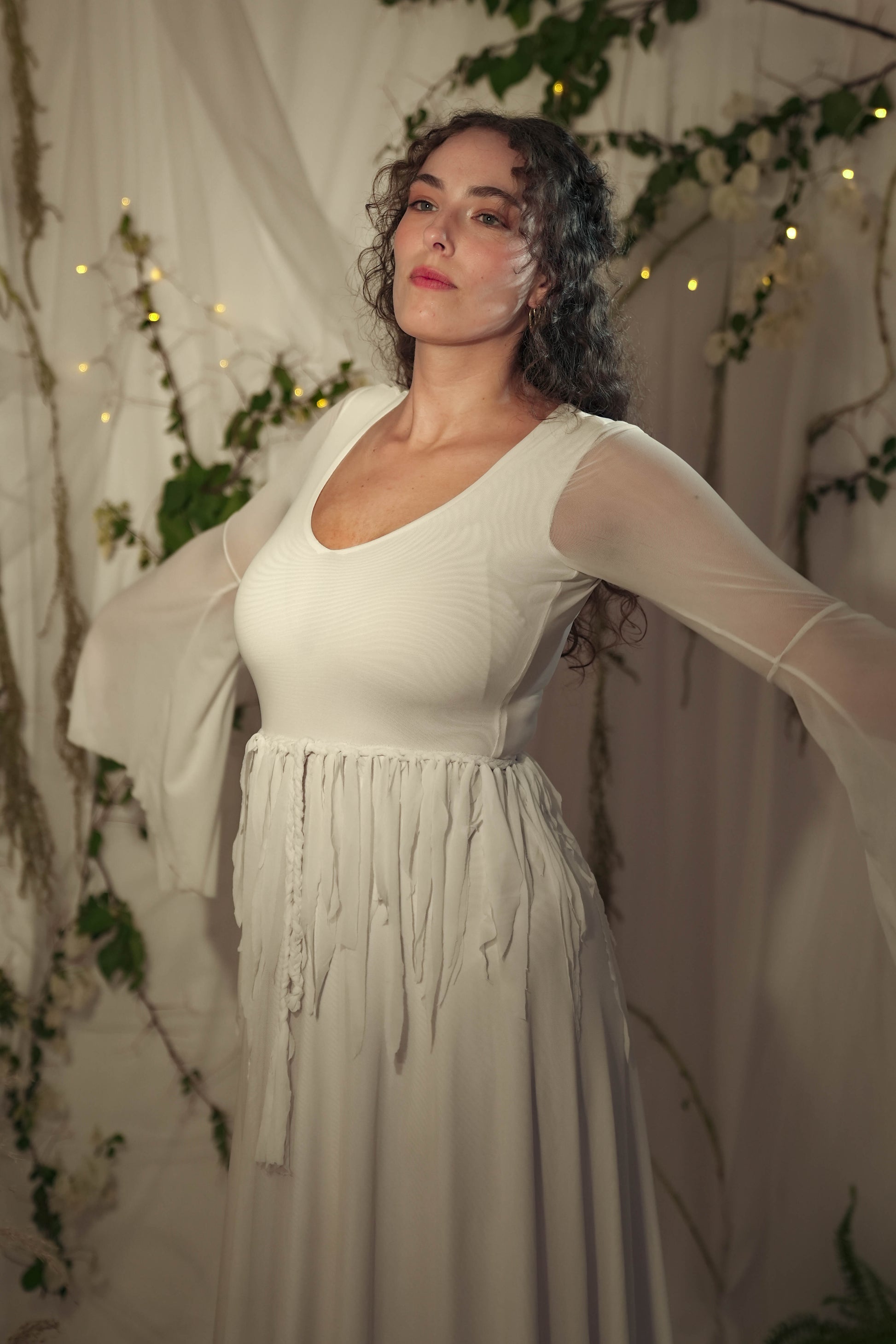 שמלת כלה קסומה עם שרוולים מתרחבים ופרנזים