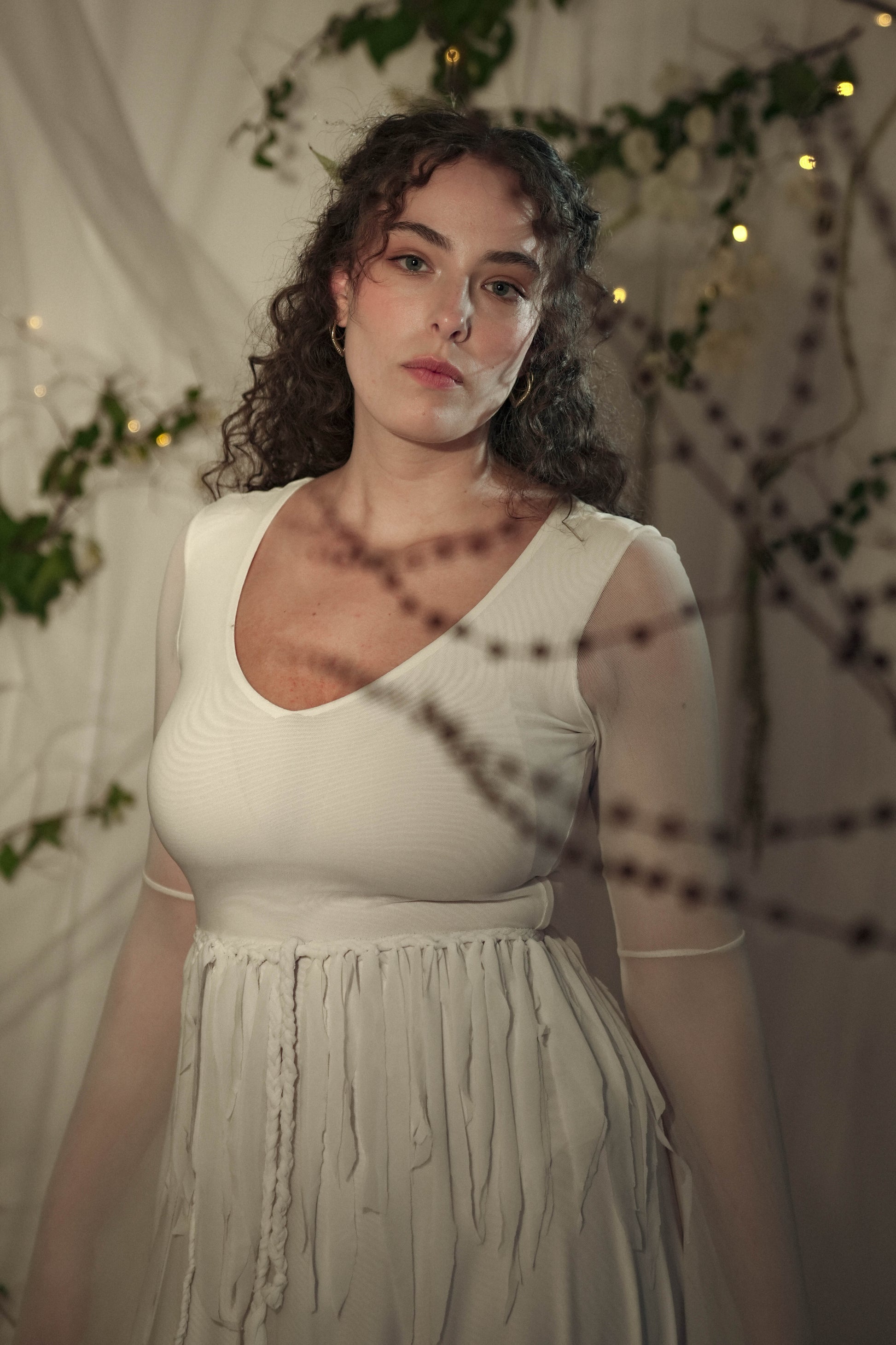 השמלה מיוצרת מבד שיפון לייקרה אלסטי ורך על הגוף